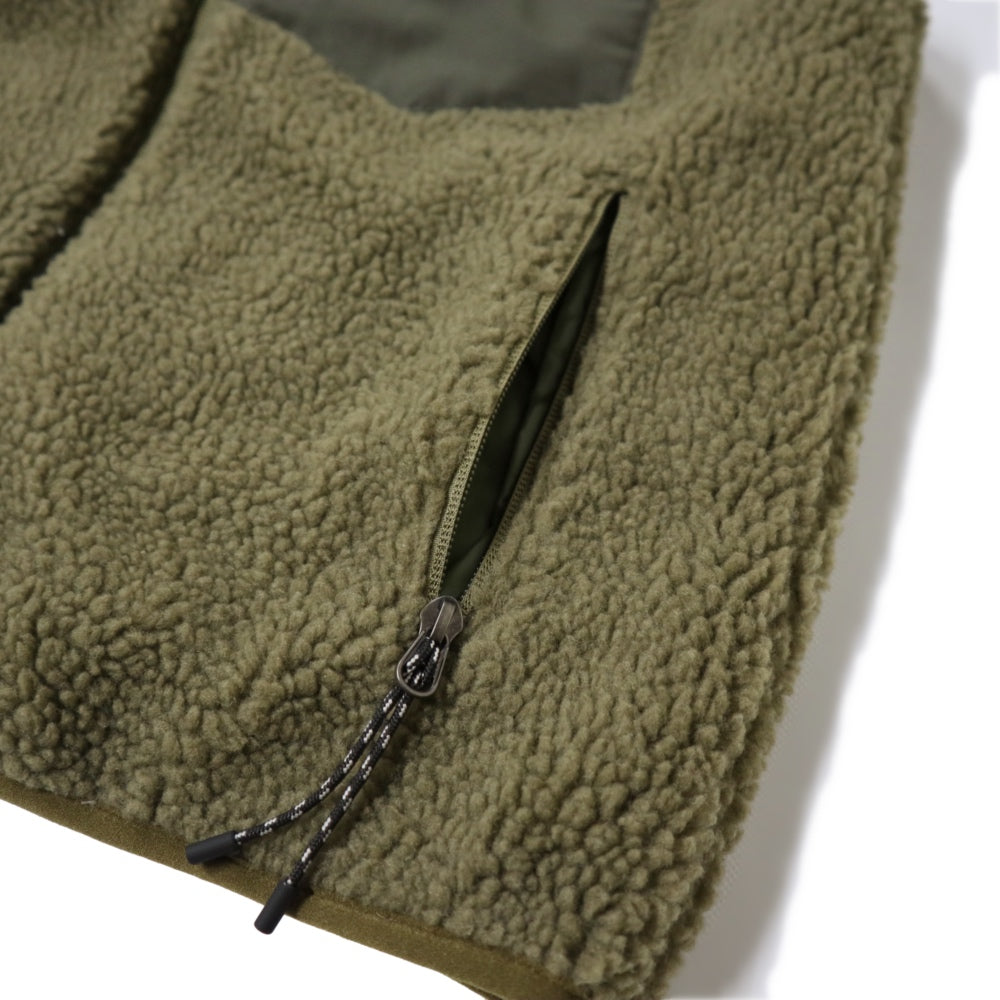 表側には、ナイロンリップストップ素材に保温性の高い800FPダウンを使用、裏側には、厚みのあるボア素材を組み合わせました。
